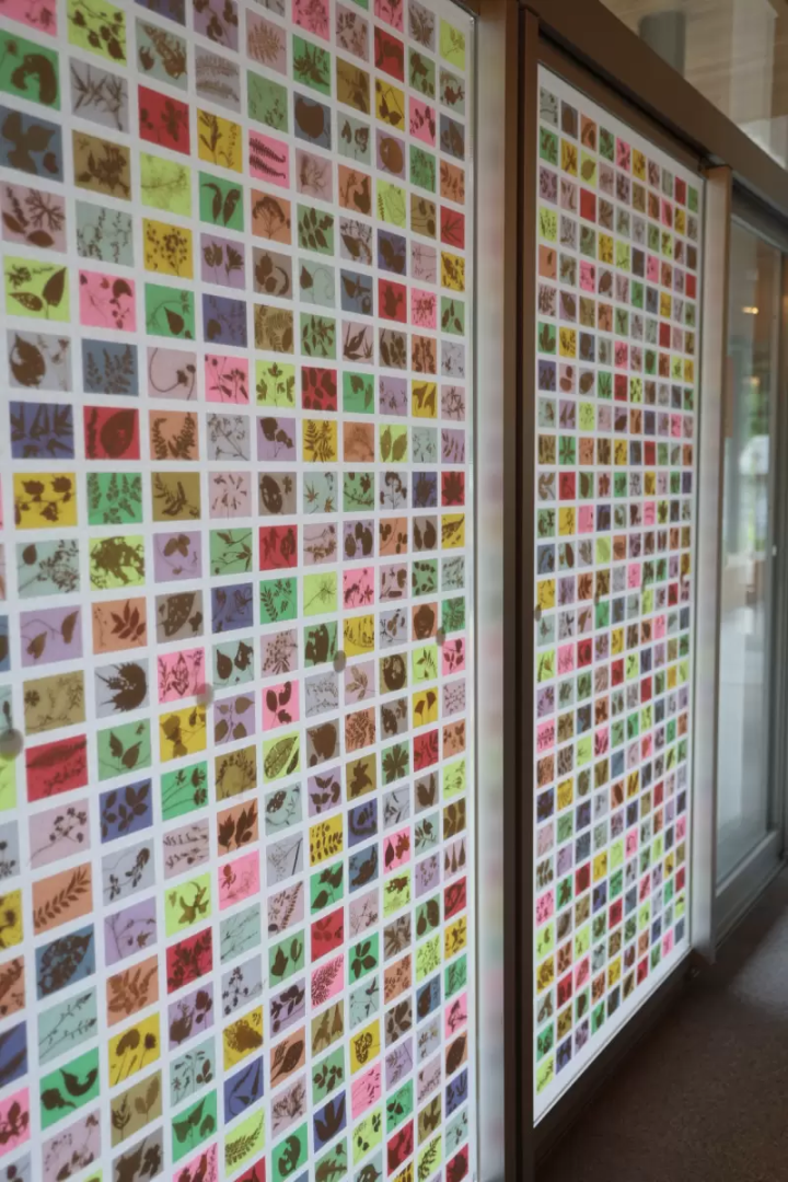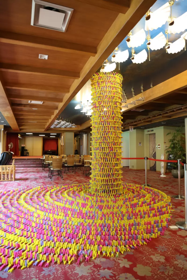 这件作品的作者是高本敦希,她正在研究如何将美好的日常物品和材料从其原有的角色中解放出来,并将它们组合起来,从而重新思考现代社会。仔细观察,我发现它是由无数色彩缤纷的衣夹组成的,构成了一个形状。如此熟悉的材料竟然能被转化成如此一件艺术品,令我印象深刻。它陈列在酒店入口处的大厅地板上,欢迎宾客的光临。