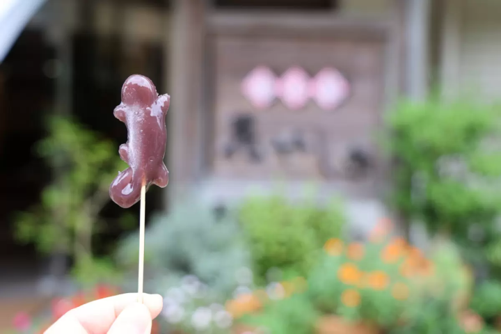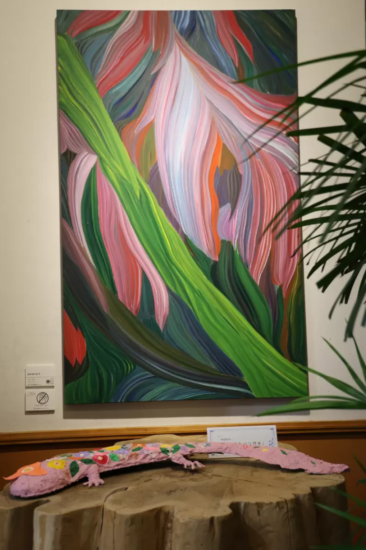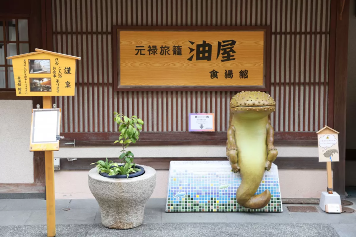 汤原温泉有各种以国家天然纪念物“半崎”大鲵为主题的艺术作品。在元禄旅笼屋油屋的入口处,松冈彻的新作《与半崎先生一起休息》正在迎接宾客。