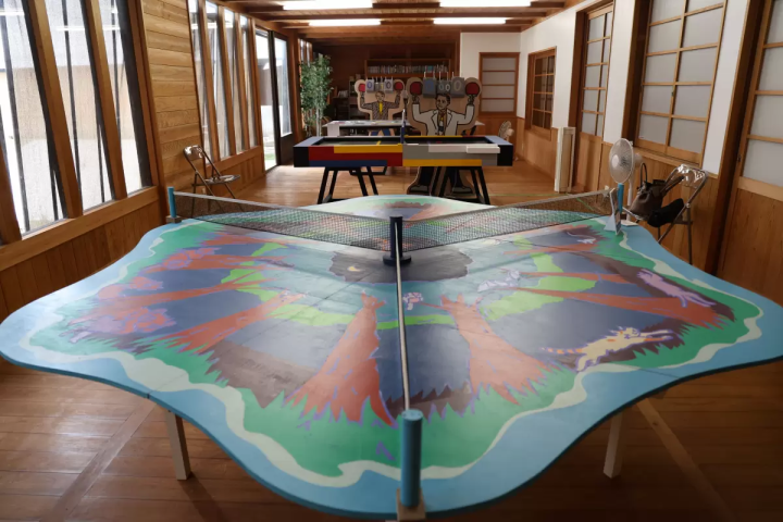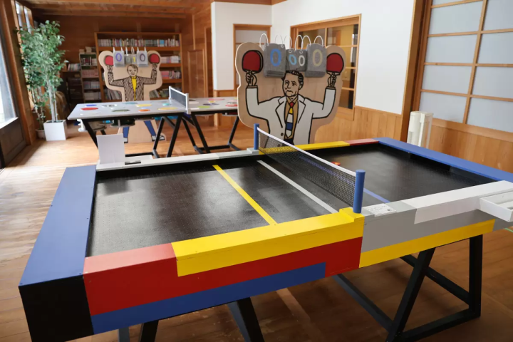 旅馆的休息空间里,摆放着一张色彩缤纷、造型独特的乒乓球桌。这是艺术家组合“原伦太郎+原有”的作品。这是我从未见过的形状,一下子就勾起了我的玩味儿。其实,300日元就可以玩30分钟。