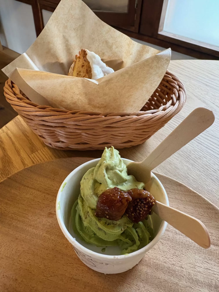 You can choose between a cup or a cone (waffle cone) for the mixed ice cream, so I chose the cup. The ice cream base was matcha (powdered Japanese green tea) mixed with dried figs, and I had it with a scone. The chewy ice cream was accented with crushed dried fruit, which was very delicious. It was an ice cream packed with all my favorite things! The ice cream and scone went well together, and I was full.