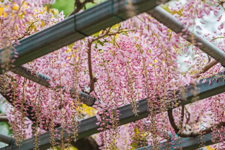 After the cherry blossom season has passed, beautiful wisteria flowers herald the arrival of spring in Okayama. Wake Town's Fuji Park boasts the largest variety of wisteria in Japan, with around 100 varieties of wisteria collected from all over the country in full bloom. The park features a wisteria trellis stretching for a total of 500 meters, and the sight of purple, white, and pink flower clusters falling from above is like a shower of flowers.