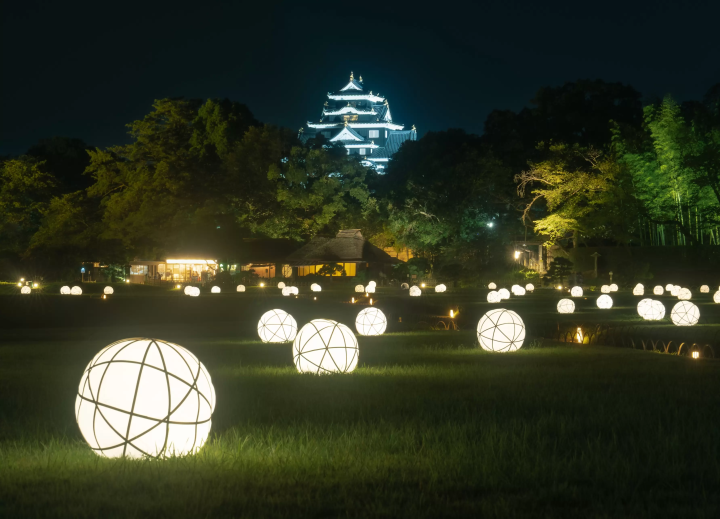The garden is bathed in the soft andgraceful light of bamboo ball lanterns against the backdrop of the castleilluminated in the night sky. One can imagine the peaceful expressions ofpeople strolling through the grounds.