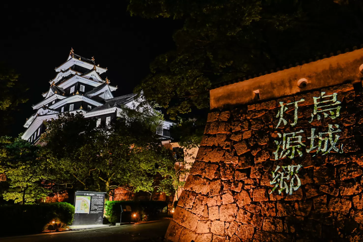 Behind the characters “Ujo -Togenkyo” projected onto the stone walls, Okayama Castle emerges against the pitch-blacknight sky, creating a striking and eye-catching photo. The composition is outstanding.