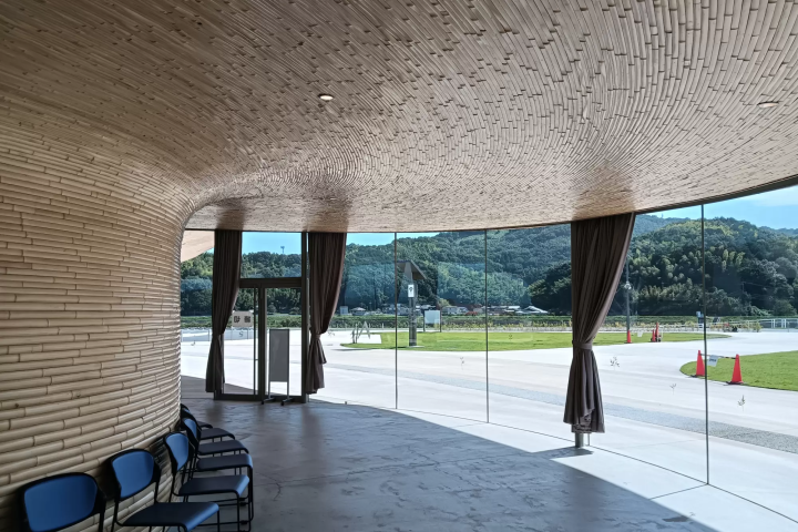 Towering in the Chuo of the park is an impressive gate made of bamboo. Its large roof harmonizes with the Mabi Mountains and was built using bamboo, a local specialty. On either side of the gate are the "Learning Room" community facility and a disaster preparedness storehouse. Here too, Kuma Architecture's spirit of valuing the thoughts of the local people and local materials is evident.