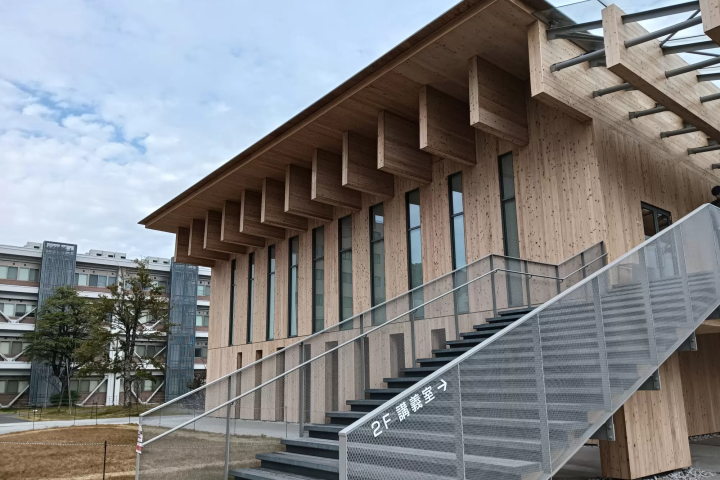 The " Kyōiku Kyōsō Commons " located on Okayama University Tsushima Campus is a wooden classroom designed to serve as a life-size teaching material for students studying wooden architecture. The wood used is CLT, a consistent expression of Kuma Architecture's philosophy of using local materials.