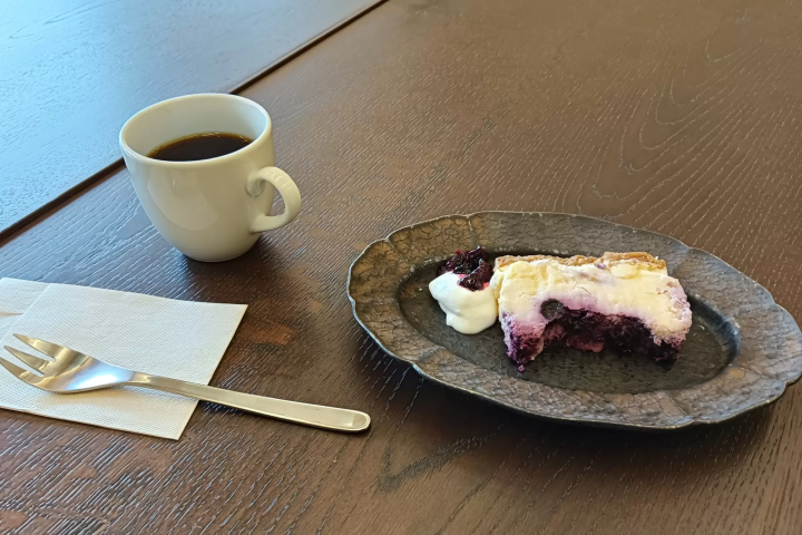 Since I visited in the afternoon, I ordered the New York Cheesecake set (990 yen) made with blueberries from the local Kibichuo Town, and coffee. The rich flavor of the cream cheese and fresh cream is exquisite. Inside the store, there are also Kengo Kuma 's autographs, architectural models, and a book corner, so it's a great place to spend some time finding your favorite book.