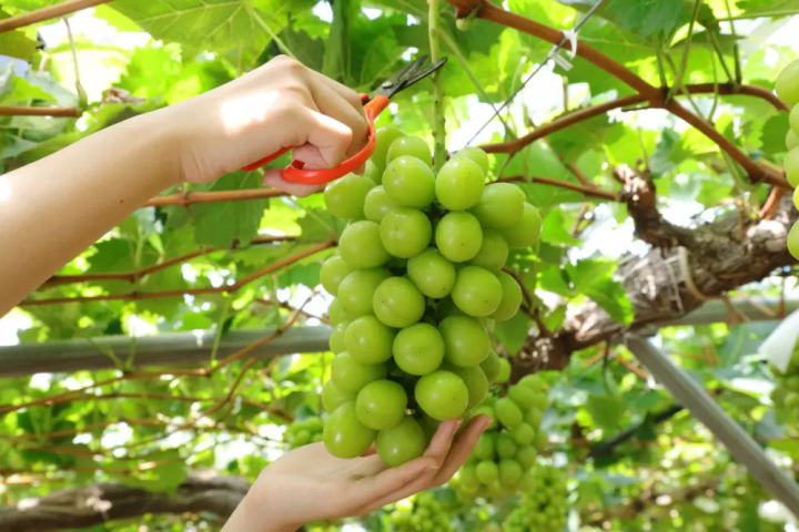 Grape Picking offers a wide variety of grapes, including the traditional Muscat of Alexandria, the large, seedless New Pione, and Shine Muscat, which can be enjoyed with the skin on.