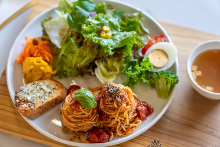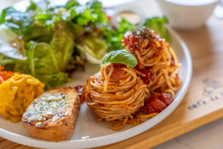The Wake Alps have become popular in recent years as a place where hikers of all levels, from beginners to advanced climbers, can enjoy hiking. cafe gouter is a mother-daughter cafe located at the foot of the mountain. Lunch options here range from set meals such as hamburger steaks, grilled fish, and pork cutlets, to curry, doria, Japanese-style chicken and mushroom pasta, seafood mentaiko cream pasta, and fried eggplant pasta with meat sauce, as well as pizza made with homemade dough.