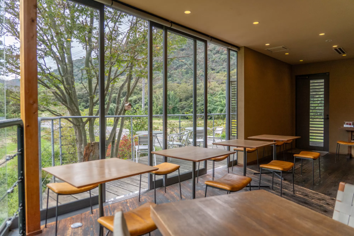 The first thing that catches your eye inside the store are the large windows that reflect the surrounding nature. The simple tables and stools made of iron, wood, and leather blend in with the space, creating a calming atmosphere.