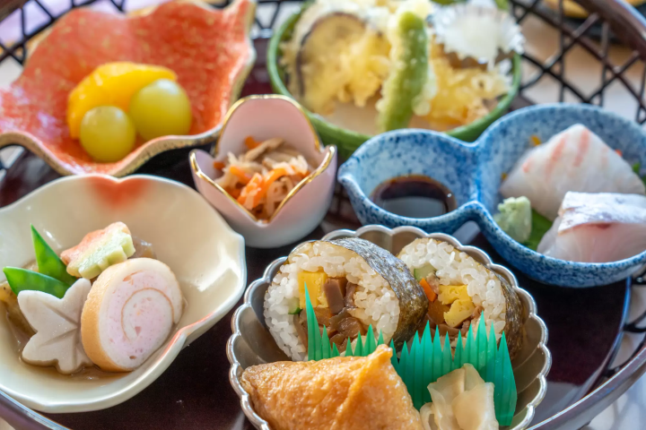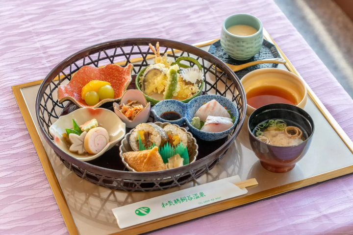 The "Nagomi Zen" (1,480 yen) is a popular lunchtime menu item, with six colorful dishes placed in a basket. It's a satisfying meal that includes sushi (inari sushi and Sukeroku sushi) made with local Asahi rice, fresh sashimi from the local market, a mixed vegetable and fish paste dish, tempura (deep-fried dishes in batter), small side dishes, and fruit. It also comes with an elegant chawanmushi (egg dish) and miso soup, so it's no wonder it's so popular with people of all ages and genders.