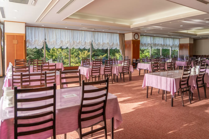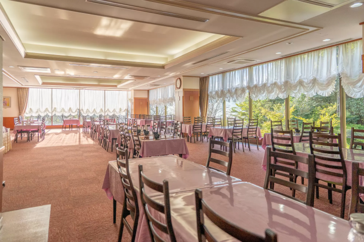 The spacious interior has large windows on two sides, and tables are comfortably spaced. If you sit by the windows, you can enjoy a view of the Japanese garden with its waterfall, and in spring, the cherry blossoms along the Yoshii River. On Saturdays and Sundays, many people visit from the Kansai region (around Osaka and Kobe), and the restaurant is so popular that there are lines before it even opens. In addition to people eating before or after a day trip to the hot springs, there is also a children's menu (500 yen), so it seems to be increasingly popular with families with children visiting the nearby Wakemaro Park.