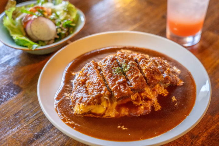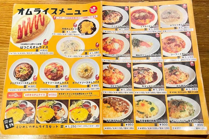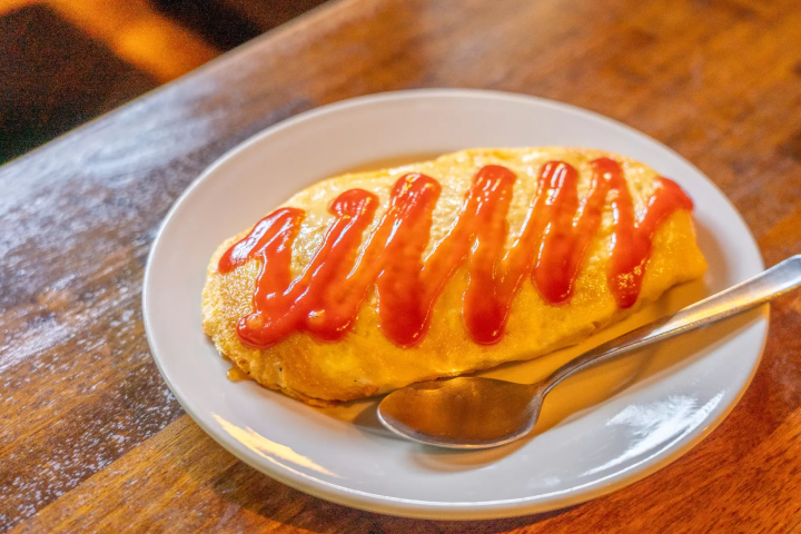 This restaurant near JR Wake Station specializes in omelet rice during the day and operates as an izakaya (Japanese pub) at night. The "Hatsukoe Omelette Rice" (regular, 800 yen) is a traditional style of ketchup rice wrapped in a thin omelet, a dish that has been loved for nearly 100 years since the restaurant opened in 1928. This ketchup rice is stuffed with pork belly. After the war, when chicken was hard to come by, the first owner started using pork, and this recipe has remained unchanged ever since. The rich flavor of the well-fried onions and pork belly fat, combined with the acidity of the ketchup, creates a mellow, rich taste that can only be found here. Regular customers apparently eat it with Worcestershire sauce (a Japanese vegetable and fruit-based sauce) and pepper instead of ketchup.