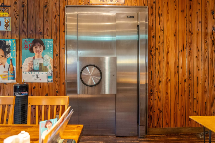 There's something intriguing on the wall inside the restaurant. It's actually the door to a safe. The building was formerly a JA (agricultural cooperative) bank, so the heavy safe remains intact and you can enjoy your meal inside. If you're interested in eating here, you can make a reservation.