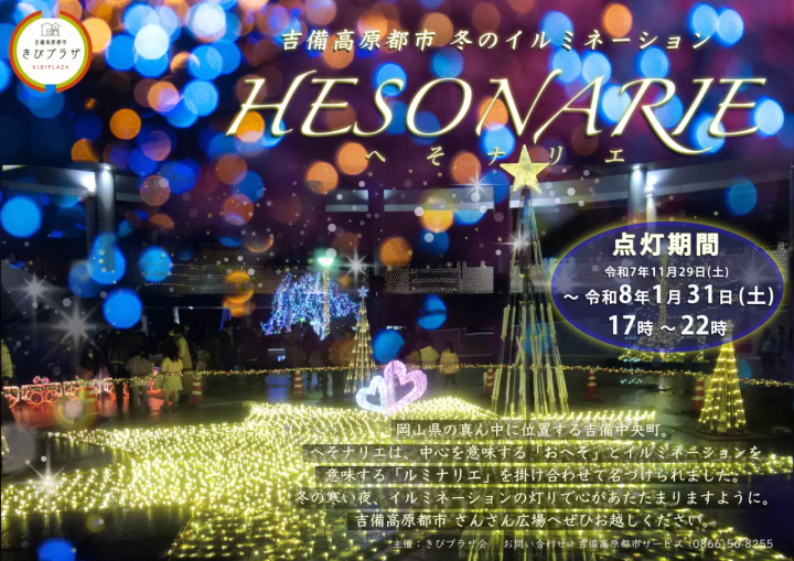 La ville de Kibi Chuo se situe au cœur de la préfecture d'Okayama. Son nom, « Heso Narie », est la contraction de « navel » (nombril), qui signifie centre, et « Luminarie », qui signifie illumination. Cette ville des hauts plateaux de Kibi est ornée de magnifiques illuminations qui réchauffent les cœurs même lors des froides nuits d'hiver.