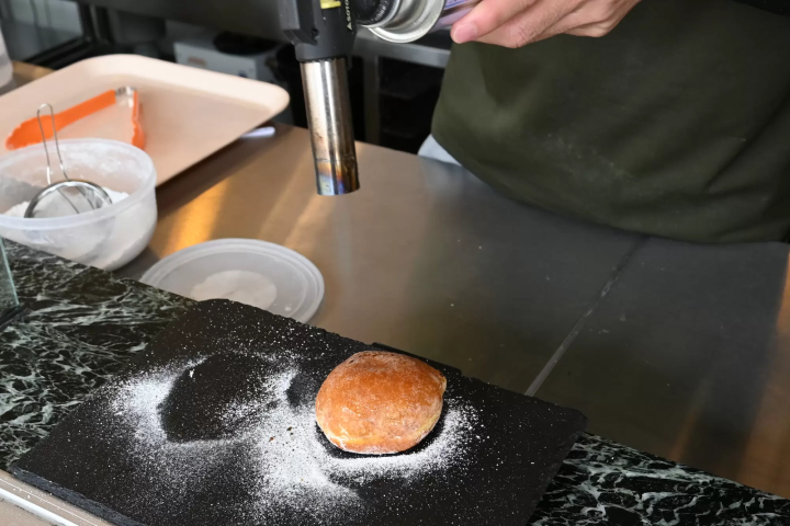 시그니처 상품은 "브륄레 도넛"입니다. 주문을 받으면 도넛에 커스터드 크림(달콤한 크림)을 채우고 슈가파우더를 뿌린 후, 바로 눈앞에서 버너로 구워내는데, 생동감 넘치는 분위기가 매우 인기입니다. 많은 손님들이 이 과정을 영상으로 촬영하는데, 바삭하고 향긋한 겉면과 촉촉한 속의 대비는 한 번 맛보면 잊을 수 없는 맛입니다.
