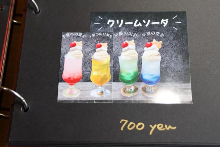 다른 종류로는 " 치야 (Chiya) 를 위한 사랑의 색깔"이라는 빨간색 소다, " 치야 (Chiya) 의 산의 색깔"이라는 초록색 소다, " 치야 (Chiya) 의 하늘의 색깔"이라는 파란색 소다가 있는데, 이름에서 치야 (Chiya) 에 대한 사장님의 애정을 느낄 수 있습니다. 물론 아이스크림과 휘핑크림 위에는 고양이 장식이 있습니다.