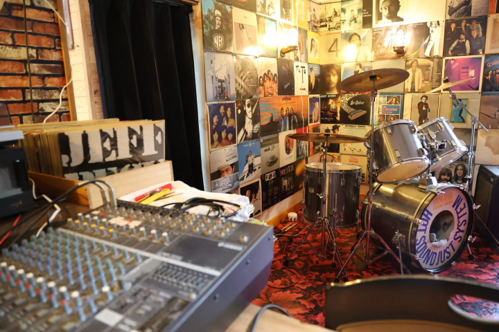 카페 메뉴의 모든 메뉴는 재료부터 디자인과 네이밍까지 모두 신중하게 선택되었으며, 사장님의 "로맨틱 맨즈 룸"도 안내받았습니다. 카페 옆에 위치한 이곳은 비밀 아지트나 바처럼 보이지만, 전문 드럼과 음향 장비를 갖추고 있으며, 벽에 걸린 레코드들은 귀중한 컬렉션입니다.