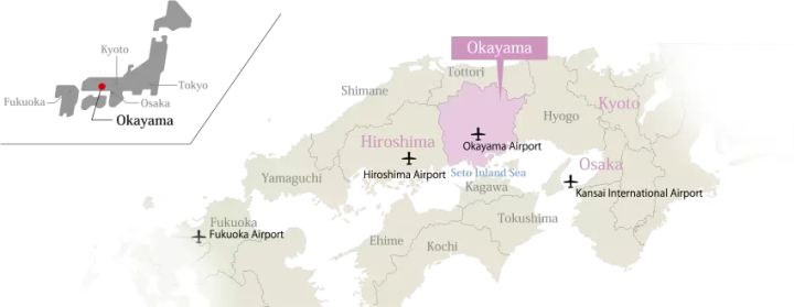 岡山縣位於日本西部中央,距離大阪約 45 分鐘路程,距離京都約 1 小時新幹線車程,是觀光旅遊的理想出發地。
